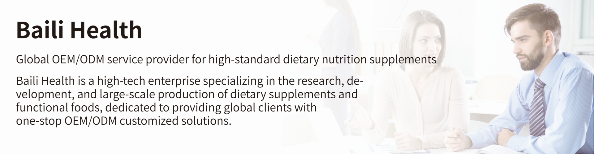 Baili Health offers full-formula OEM/ODM services with an annual capacity of 2 billion gummies, 200 million softgels, 3 billion tablets, 50 million powder sachets, and 100,000 bottles per day for liquids/pastes.
